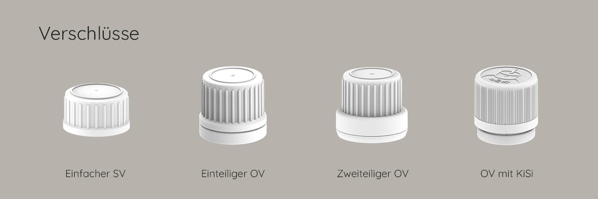 - alle Verschlusssysteme sind mit der Norm DIN ISO 11418-3 Tropfflasche abgestimmt